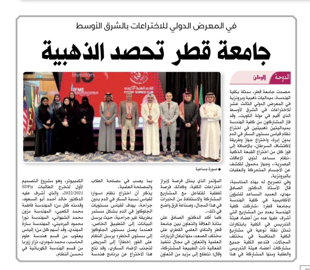 Dr. Khalid Abualsaud and his team have won the golden medal on an invention resulted from the CSE Senior Design Project (SDP) 2021/2022. Other colleagues from our department as well as the Department of Electrical Engineering have contributed to improve the work. The invention was filed under QU tracking code QU2022-022 and reporting U.S. Provisional Patent Application No. 63/421, 416 filed November 1, 2022. Ref: 432743.10335 [I-AMS.FID5168591] in the United States Patent and Trademark Office (USPTO). The system aims for continuous accurate blood glucose monitoring in a non-invasive manner. The current idea is that the device continuously measures blood sugar and notifies the patient in case of a significant increase in blood sugar that exceeds the limit of normal sugar level, or in case it drops below the limit.